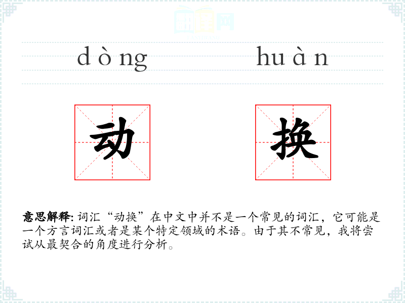 词汇“动换”在中文中并不是一个常见的词汇,它可能是一个方言词汇或者是某个特定领域的术语。由于其不常见,我将尝试从最契合的角度进行分析。