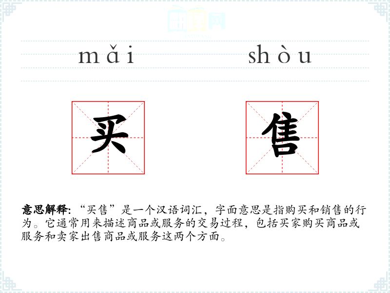 在英语中,“买售”可以对应为“buying and selling”,虽然在表达上略有不同,但核心意义相同。