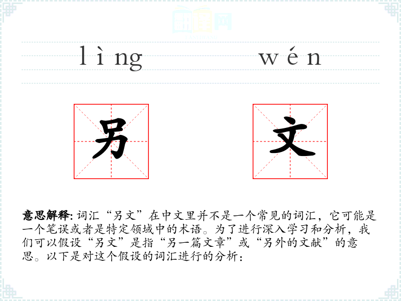 词汇“另文”在中文里并不是一个常见的词汇,它可能是一个笔误或者是特定领域中的术语。为了进行深入学习和分析,我们可以假设“另文”是指“另一篇文章”或“另外的文献”的意思。以下是对这个假设的词汇进行的分析: