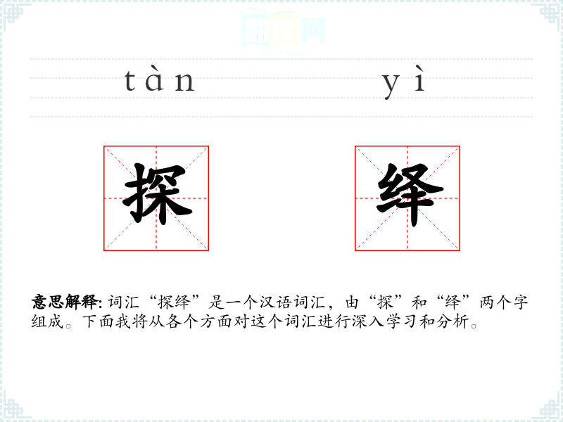 词汇“探绎”是一个汉语词汇,由“探”和“绎”两个字组成。下面我将从各个方面对这个词汇进行深入学*和分析。