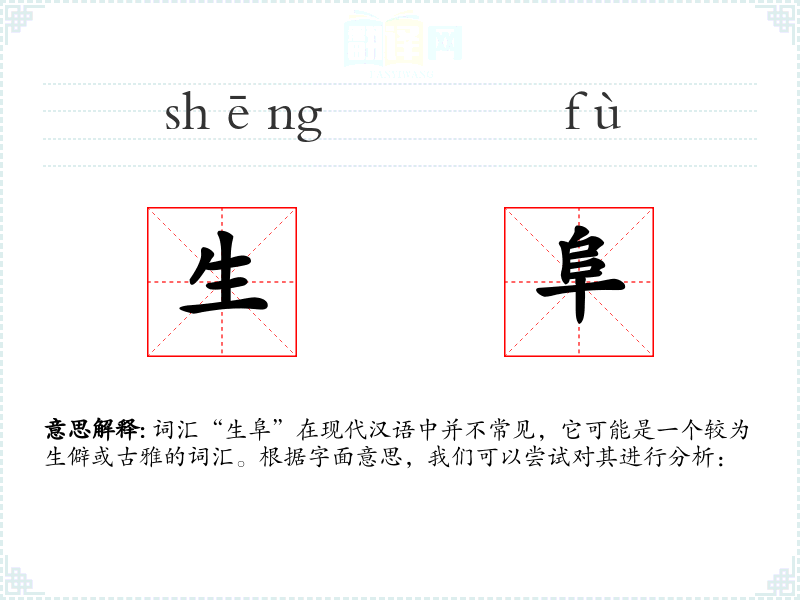 词汇“生阜”在现代汉语中并不常见,它可能是一个较为生僻或古雅的词汇。根据字面意思,我们可以尝试对其进行分析: