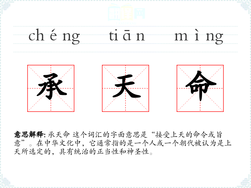 承天命 这个词汇的字面意思是“接受上天的命令或旨意”。在中华文化中,它通常指的是一个人或一个朝代被认为是上天所选定的,具有统治的正当性和神圣性。