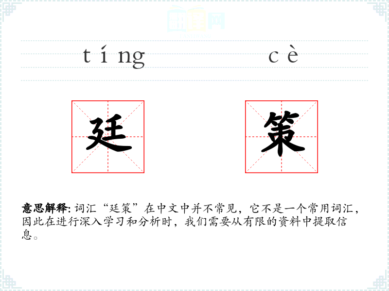 词汇“廷策”在中文中并不常见,它不是一个常用词汇,因此在进行深入学*和分析时,我们需要从有限的资料中提取信息。