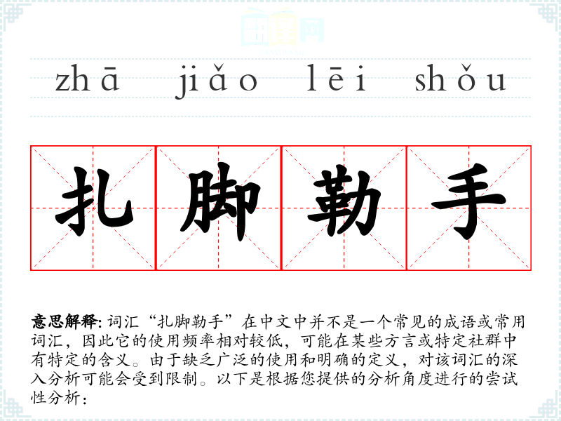 词汇“扎脚勒手”在中文中并不是一个常见的成语或常用词汇,因此它的使用频率相对较低,可能在某些方言或特定社群中有特定的含义。由于缺乏广泛的使用和明确的定义,对该词汇的深入分析可能会受到限制。以下是根据您提供的分析角度进行的尝试性分析: