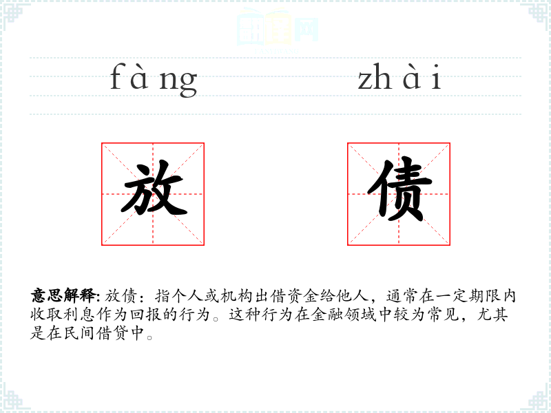 放债一词源于古代汉语,其中“放”意为“给予”或“出借”,“债”指债务或借款。随着时间的推移,这个词在金融领域的使用逐渐专业化,但其基本含义保持不变。