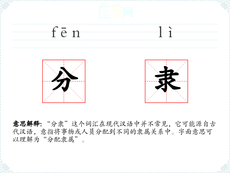 “分隶”这个词汇在现代汉语中并不常见,它可能源自古代汉语,意指将事物或人员分配到不同的隶属关系中。字面意思可以理解为“分配隶属”。