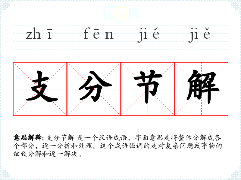 支分节解 是一个汉语成语,字面意思是将整体分解成各个部分,逐一分析和处理。这个成语强调的是对复杂问题或事物的细致分解和逐一解决。