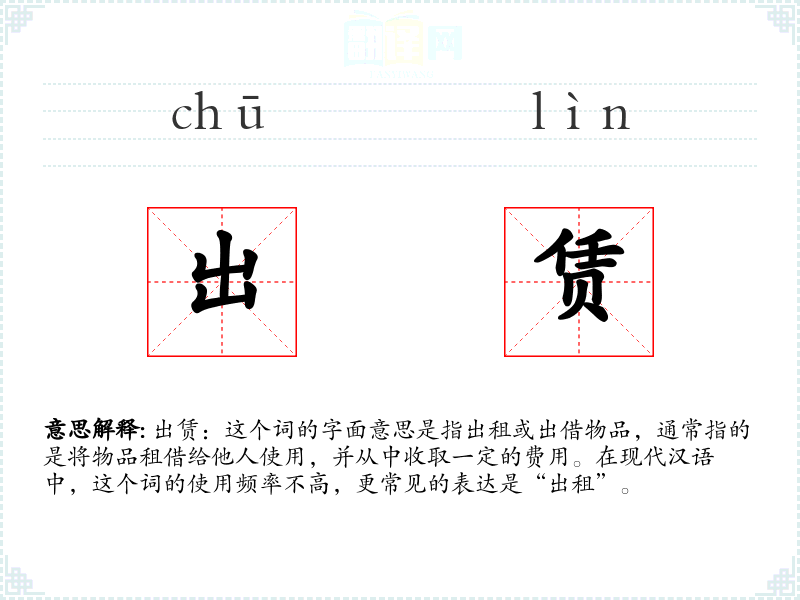 出赁:这个词的字面意思是指出租或出借物品,通常指的是将物品租借给他人使用,并从中收取一定的费用。在现代汉语中,这个词的使用频率不高,更常见的表达是“出租”。