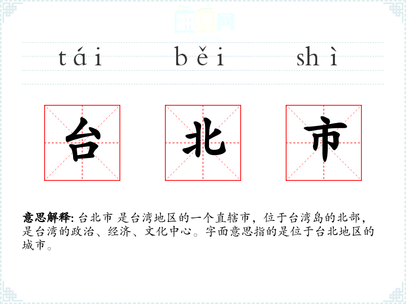 台北市 是台湾地区的一个直辖市,位于台湾岛的北部,是台湾的政治、经济、文化中心。字面意思指的是位于台北地区的城市。