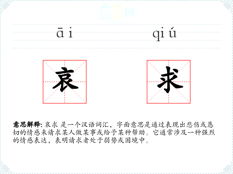 哀求 是一个汉语词汇,字面意思是通过表现出悲伤或恳切的情感来请求某人做某事或给予某种帮助。它通常涉及一种强烈的情感表达,表明请求者处于弱势或困境中。