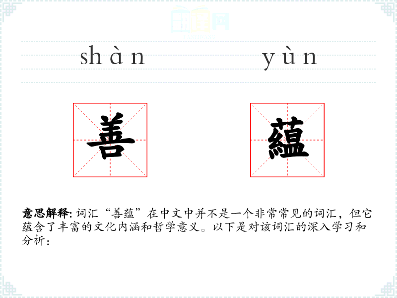 词汇“善蕴”在中文中并不是一个非常常见的词汇,但它蕴含了丰富的文化内涵和哲学意义。以下是对该词汇的深入学*和分析: