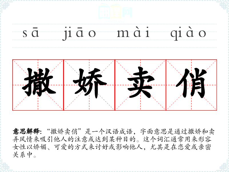 “撒娇卖俏”是一个汉语成语,字面意思是通过撒娇和卖弄风情来吸引他人的注意或达到某种目的。这个词汇通常用来形容女性以娇媚、可爱的方式来讨好或影响他人,尤其是在恋爱或亲密关系中。