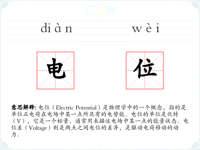 - 反义词:无直接反义词,但电位差(Voltage)可以视为电位的相对概念。