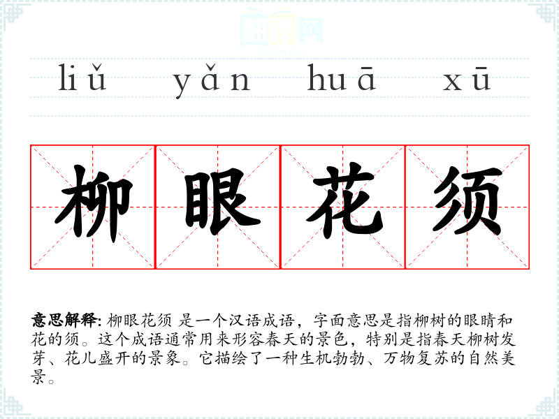 柳眼花须 这个成语的词源较为模糊,但它显然是受到**古代文学中对自然景物的细腻描绘的影响。随着时间的推移,这个成语被广泛用于文学作品中,用以表达春天的美好和生机。