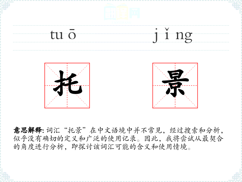 词汇“托景”在中文语境中并不常见,经过搜索和分析,似乎没有确切的定义和广泛的使用记录。因此,我将尝试从最契合的角度进行分析,即探讨该词汇可能的含义和使用情境。