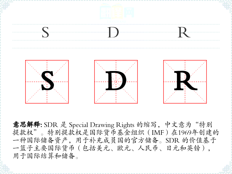 SDR 是 Special Drawing Rights 的缩写,中文意为“特别提款权”。特别提款权是国际货币基金组织(IMF)在19*9年创建的一种国际储备资产,用于补充成员国的官方储备。SDR 的价值基于一篮子主要国际货币(包括美元、欧元、人民币、日元和英镑),用于国际结算和储备。