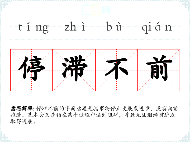 停滞不前的字面意思是指事物停止发展或进步,没有向前推进。基本含义是指在某个过程中遇到阻碍,导致无法继续前进或取得进展。