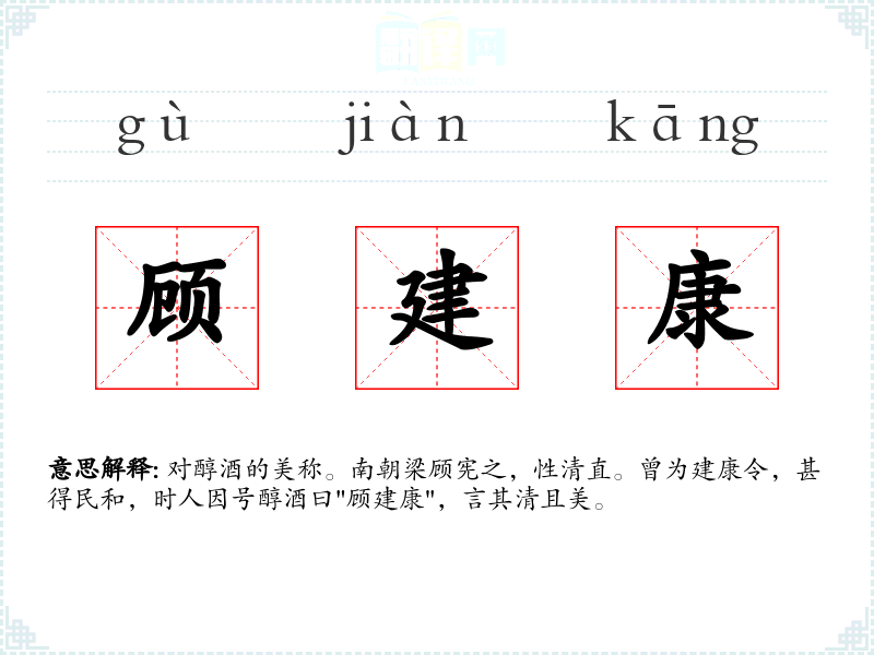 对醇酒的美称。南朝梁顾宪之,性清直。曾为建康令,甚得民和,时人因号醇酒曰"顾建康",言其清且美。