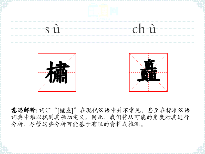 词汇“[樚矗]”在现代汉语中并不常见,甚至在标准汉语词典中难以找到其确切定义。因此,我们将从可能的角度对其进行分析,尽管这些分析可能基于有限的资料或推测。