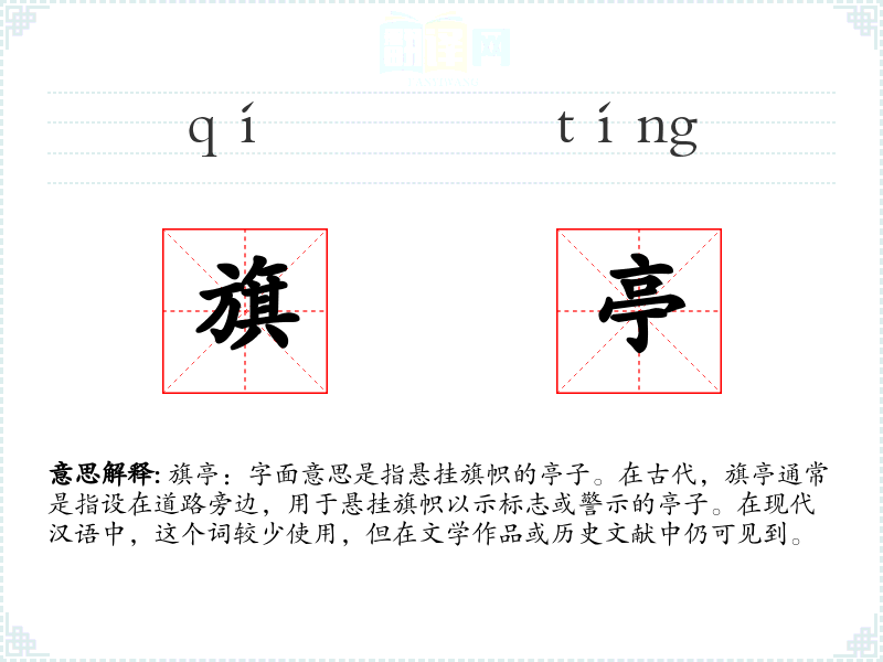 - 专业领域:在历史学或建筑学领域,旗亭可能被用来指代特定类型的古代建筑。