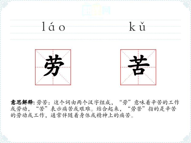 劳苦:这个词由两个汉字组成,“劳”意味着辛苦的工作或劳动,“苦”表示痛苦或艰难。结合起来,“劳苦”指的是辛苦的劳动或工作,通常伴随着身体或精神上的痛苦。
