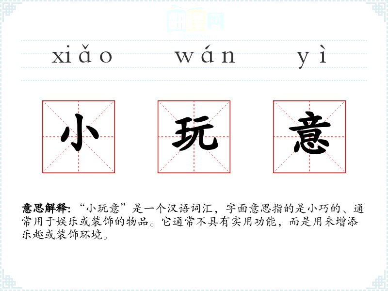 “小玩意”是一个汉语词汇,字面意思指的是小巧的、通常用于娱乐或装饰的物品。它通常不具有实用功能,而是用来增添乐趣或装饰环境。