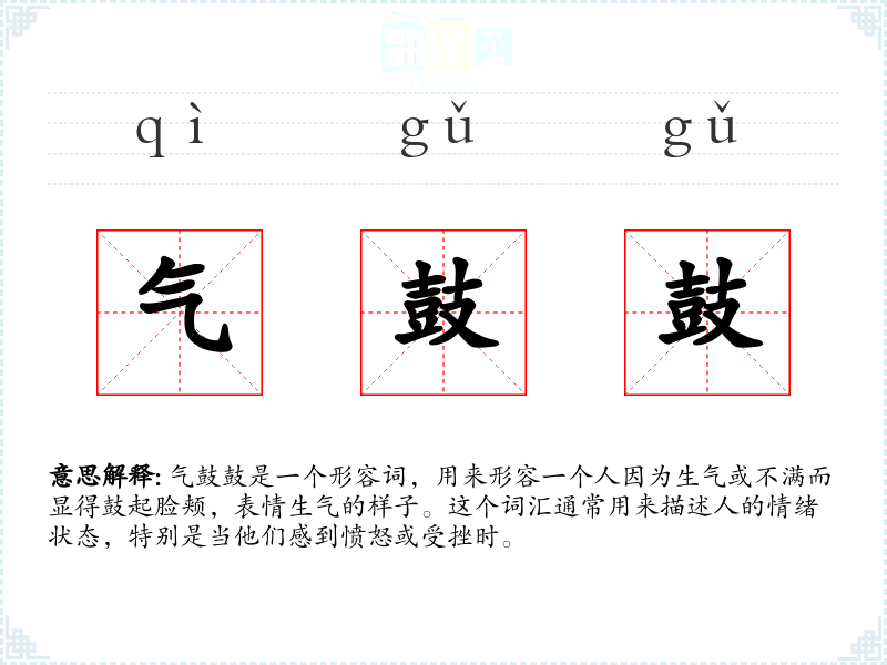 气鼓鼓是一个形容词,用来形容一个人因为生气或不满而显得鼓起脸颊,表情生气的样子。这个词汇通常用来描述人的情绪状态,特别是当他们感到愤怒或受挫时。
