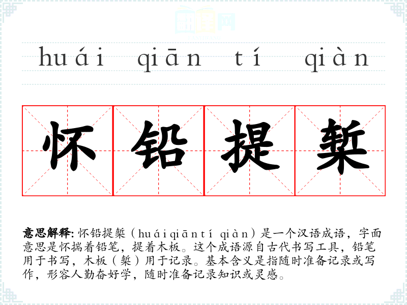 怀铅提椠(huái qiān tí qiàn)是一个汉语成语,字面意思是怀揣着铅笔,提着木板。这个成语源自古代书写工具,铅笔用于书写,木板(椠)用于记录。基本含义是指随时准备记录或写作,形容人勤奋好学,随时准备记录知识或灵感。