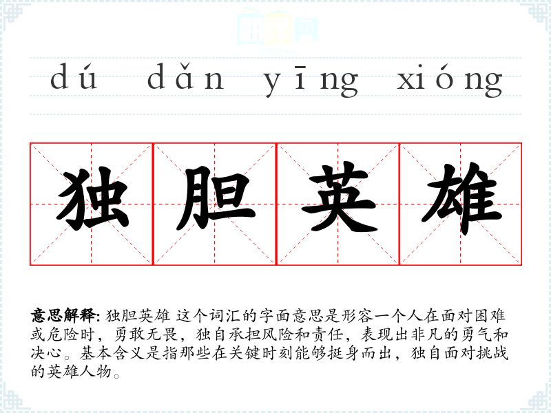 独胆英雄 这个词汇的字面意思是形容一个人在面对困难或危险时,勇敢无畏,独自承担风险和责任,表现出非凡的勇气和决心。基本含义是指那些在关键时刻能够挺身而出,独自面对挑战的英雄人物。