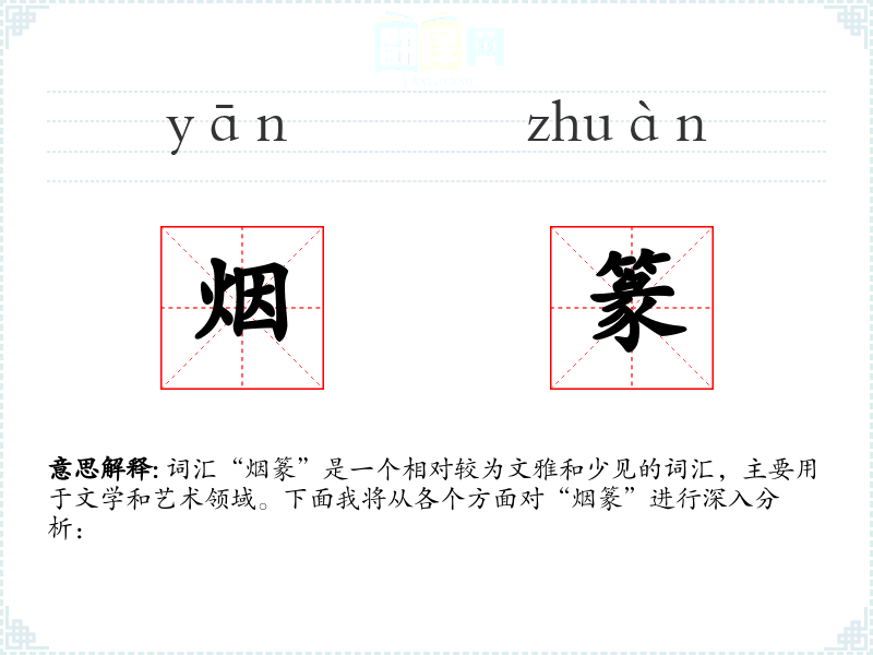 词汇“烟篆”是一个相对较为文雅和少见的词汇,主要用于文学和艺术领域。下面我将从各个方面对“烟篆”进行深入分析: