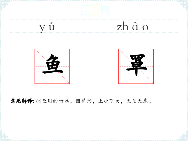 捕鱼用的竹器。圆筒形,上小下大,无顶无底。