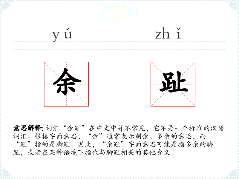 词汇“余趾”在中文中并不常见,它不是一个标准的汉语词汇。根据字面意思,“余”通常表示剩余、多余的意思,而“趾”指的是脚趾。因此,“余趾”字面意思可能是指多余的脚趾,或者在某种语境下指代与脚趾相关的其他含义。