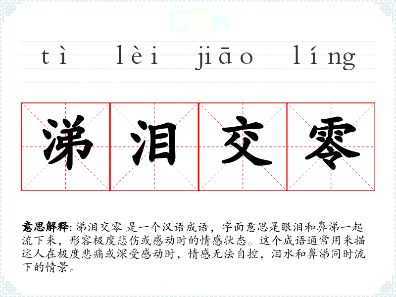 涕泪交零 是一个汉语成语,字面意思是眼泪和鼻涕一起流下来,形容极度悲伤或感动时的情感状态。这个成语通常用来描述人在极度悲痛或深受感动时,情感无法自控,泪水和鼻涕同时流下的情景。