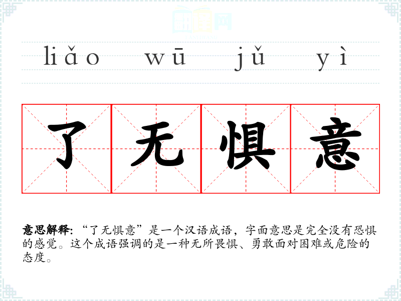 - 口语:在日常对话中,人们可能用这个成语来形容某人在某种情况下的勇敢行为,如“他在考试前了无惧意,显得非常自信。”