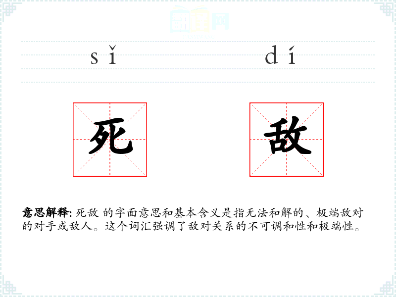 死敌 的字面意思和基本含义是指无法和解的、极端敌对的对手或敌人。这个词汇强调了敌对关系的不可调和性和极端性。