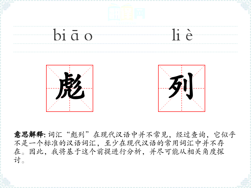 由于“彪列”不是一个标准词汇,它在不同语境下的使用非常有限,甚至可能不存在。如果强行解释,可能在一些古文或特定方言中存在某种特殊的用法,但这需要具体的文献支持。