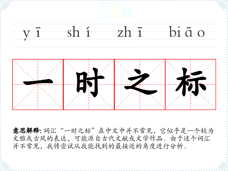 词汇“一时之标”在中文中并不常见,它似乎是一个较为文雅或古风的表达,可能源自古代文献或文学作品。由于这个词汇并不常见,我将尝试从我能找到的最接近的角度进行分析。