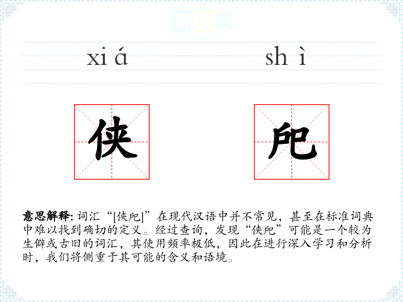词汇“[侠戺]”在现代汉语中并不常见,甚至在标准词典中难以找到确切的定义。经过查询,发现“侠戺”可能是一个较为生僻或古旧的词汇,其使用频率极低,因此在进行深入学习和分析时,我们将侧重于其可能的含义和语境。