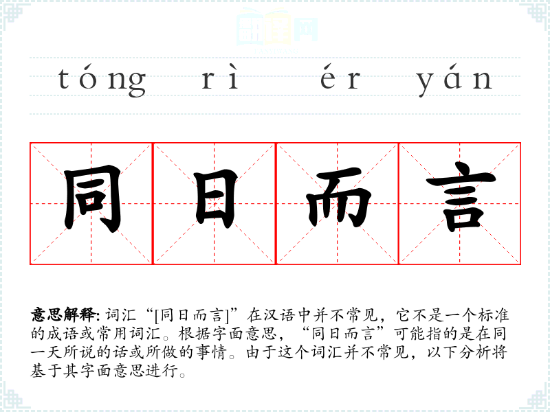 词汇“[同日而言]”在汉语中并不常见,它不是一个标准的成语或常用词汇。根据字面意思,“同日而言”可能指的是在同一天所说的话或所做的事情。由于这个词汇并不常见,以下分析将基于其字面意思进行。