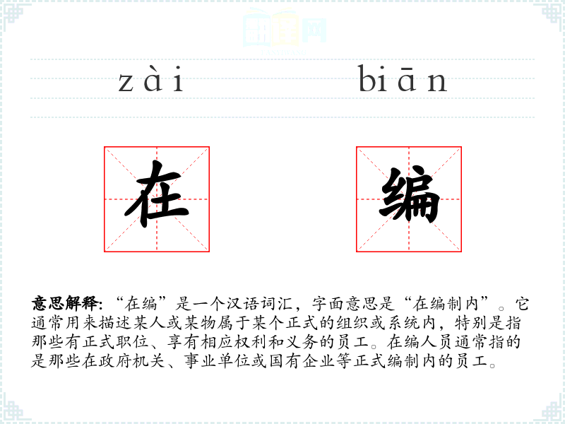 - 口语:在日常对话中,人们可能会用“在编”来区分正式员工和临时工,如“她是公司里的在编员工,所以福利待遇比较好。”
