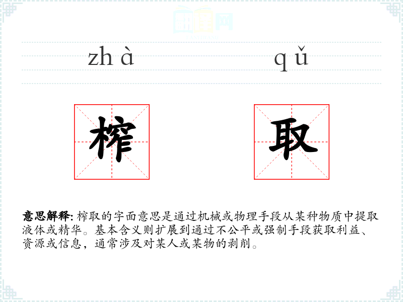 榨取的字面意思是通过机械或物理手段从某种物质中提取液体或精华。基本含义则扩展到通过不公平或强制手段获取利益、资源或信息,通常涉及对某人或某物的剥削。