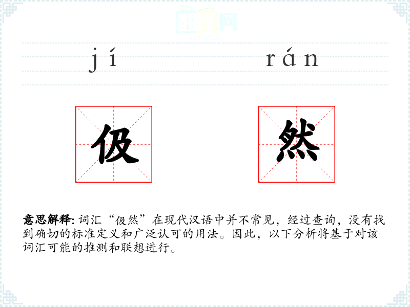 由于“伋然”不是一个标准词汇,我们无法给出确切的基本定义。但从字面上看,“伋”字不常见,可能与“急”或“汲”有关,而“然”字常表示状态或样子。因此,“伋然”可能描述一种急促或匆忙的状态。