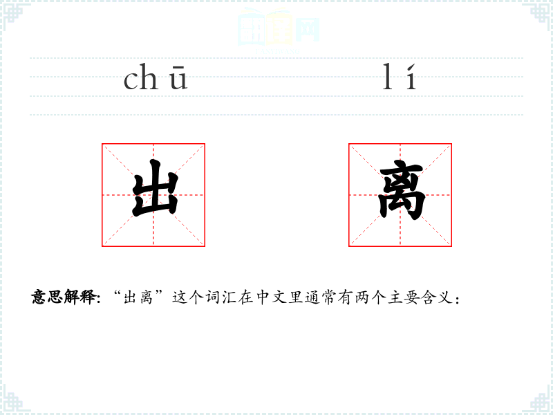 “出离”由“出”和“离”两个字组成,“出”表示向外移动,“离”表示分离。在古代汉语中,“出离”主要用于描述物理上的离开,后来逐渐扩展到心理和精神层面。