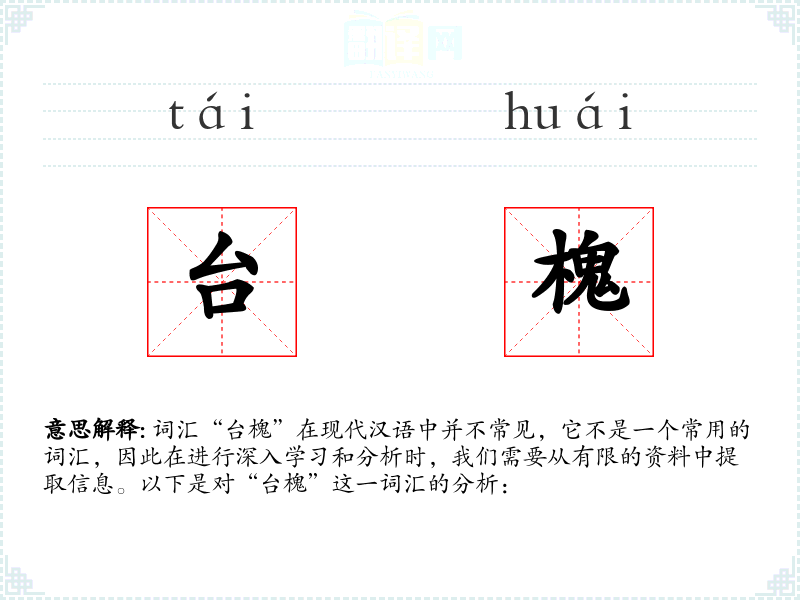 词汇“台槐”在现代汉语中并不常见,它不是一个常用的词汇,因此在进行深入学*和分析时,我们需要从有限的资料中提取信息。以下是对“台槐”这一词汇的分析: