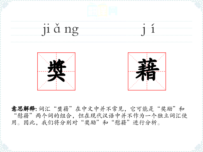 词汇“奬藉”在中文中并不常见,它可能是“奖励”和“慰藉”两个词的组合,但在现代汉语中并不作为一个独立词汇使用。因此,我们将分别对“奖励”和“慰藉”进行分析。