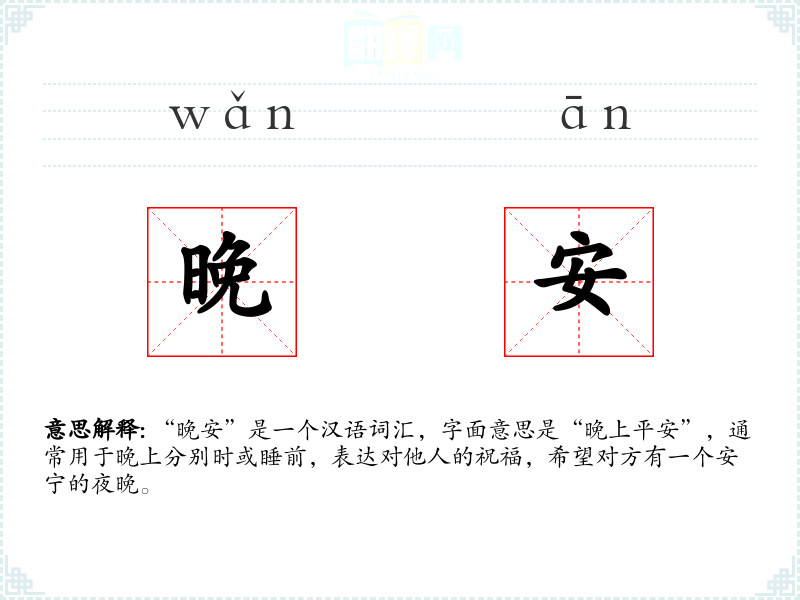 - 反义词:“早安”是“晚安”的反义词,用于早晨的问候。