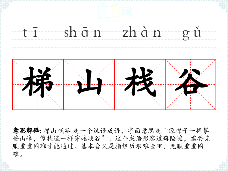 梯山栈谷 是一个汉语成语,字面意思是“像梯子一样攀登山峰,像栈道一样穿越峡谷”。这个成语形容道路险峻,需要克服重重困难才能通过。基本含义是指经历艰难险阻,克服重重困难。