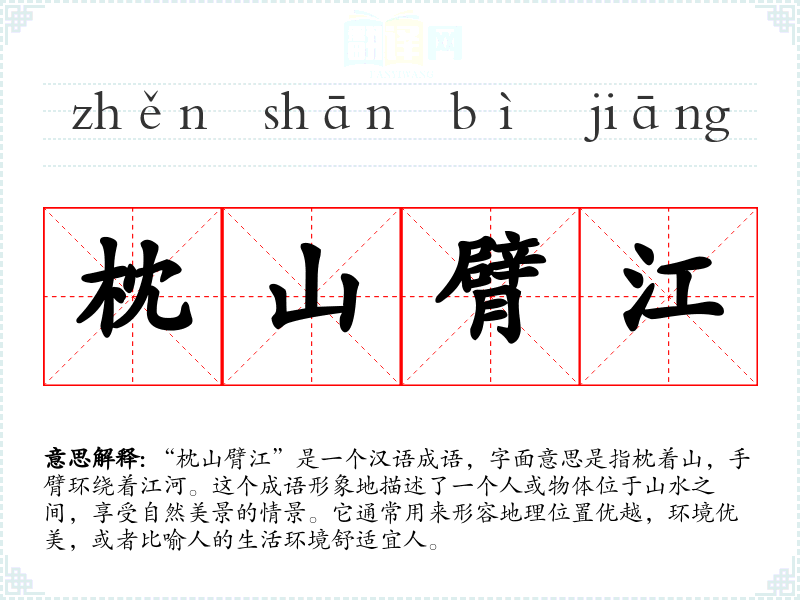“枕山臂江”是一个汉语成语,字面意思是指枕着山,手臂环绕着江河。这个成语形象地描述了一个人或物体位于山水之间,享受自然美景的情景。它通常用来形容地理位置优越,环境优美,或者比喻人的生活环境舒适宜人。