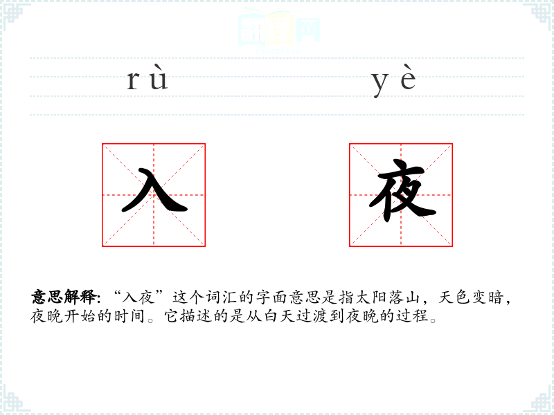 “入夜”这个词汇在中文中的使用历史悠久,其构成是由“入”和“夜”两个字组成,分别表示“进入”和“夜晚”。在古代文学和文献中,这个词汇就已经被广泛使用,至今其基本含义没有太大变化。