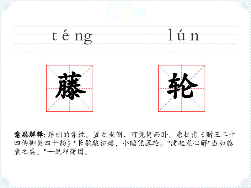 藤制的靠枕。置之坐侧,可凭倚而卧。唐杜甫《赠王二十四侍御契四十韵》"长歌敲柳瘿,小睡凭藤轮。"浦起龙心解"当如隐囊之类。"一说即蒲团。